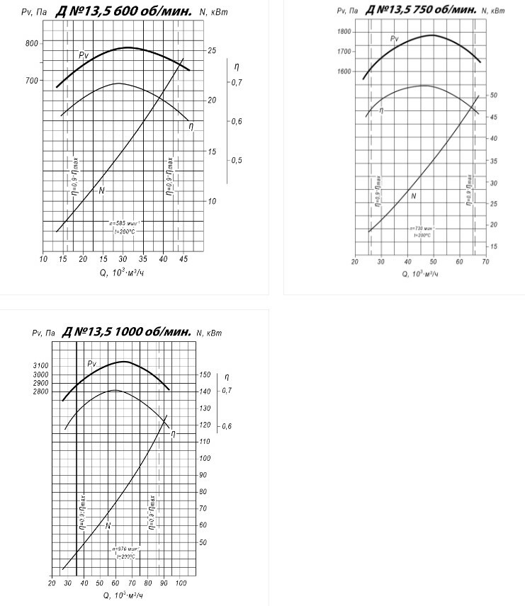 Дымосос Д №13,5 для котлов изготавливается по 3-ей конструктивной схеме (рабочее колесо соединяется с электродвигателем при помощи соединительной муфты) исполнения. Полное давление 3150 Па, производительность по воздуху 95000 м3/ч, по исполнению Д-13,5 делятся на правые и левые (по направлению вращения рабочего колеса, если смотреть со стороны электропривода). Котельный дымосос Д №13,5 одностороннего всасывания предназначен для обеспечения стабильной подачи приточного воздуха к топочным камерам котлов с уравновешенной тягой, в газомазутных котельных установках дымососы могут работать не только на вдув, но и на утилизацию дыма с максимально допустимой температурой рабочей среды до +200°С.
