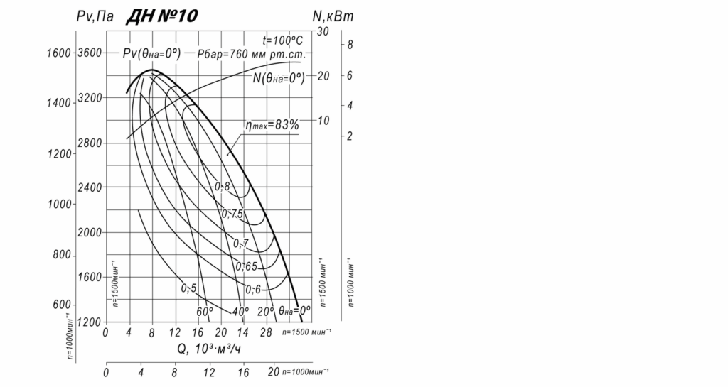 Дымосос ДН №10 изготавливается по 1-ой конструктивной схеме (соединение рабочего колеса с двигателем напрямую) и по 3-ей схеме (рабочее колесо соединяется с электродвигателем при помощи соединительной муфты) исполнения. Полное давление 3450 Па, производительность по воздуху 34000 м3/ч, по исполнению ДН-10 делятся на правые и левые (по направлению вращения рабочего колеса, если смотреть со стороны электропривода). Дутьевой вентилятор ДН №10 одностороннего всасывания предназначен для нагнетания приточного воздуха через газоходы к котельным топкам, в газомазутных котельных установках дымососы могут работать не только на вдув, но и на утилизацию дыма и летучих продуктов горения с максимально допустимой температурой рабочей среды до +200°С.