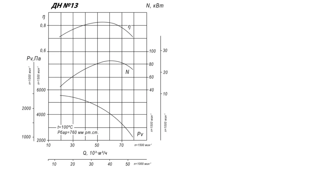 Дымосос ДН №13 изготавливается по 1-ой конструктивной схеме (соединение рабочего колеса с двигателем напрямую) и по 3-ей схеме (рабочее колесо соединяется с электродвигателем при помощи соединительной муфты) исполнения. Полное давление 5500 Па, производительность по воздуху 80000 м3/ч, по исполнению ДН-13 делятся на правые и левые (по направлению вращения рабочего колеса, если смотреть со стороны электропривода). Дутьевой вентилятор ДН №13 одностороннего всасывания предназначен для нагнетания приточного воздуха через газоходы к котельным топкам, в газомазутных котельных установках дымососы могут работать не только на вдув, но и на утилизацию дыма и летучих продуктов горения с максимально допустимой температурой рабочей среды до +200°С.
