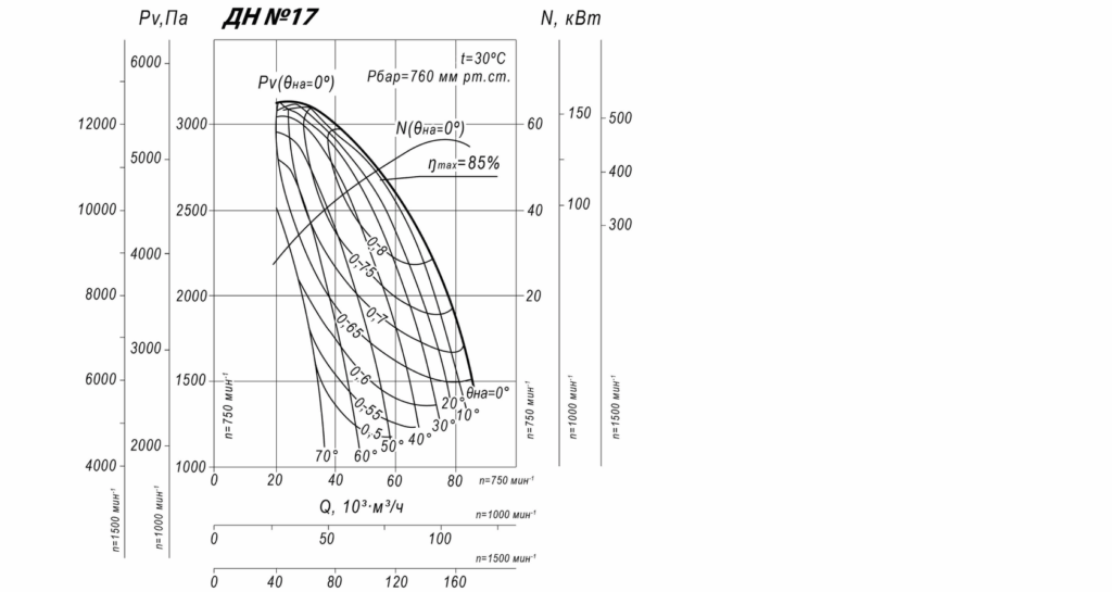 Дымосос ДН №17 изготавливается по 3-ей конструктивной схеме (рабочее колесо соединяется с электродвигателем при помощи соединительной муфты) исполнения. Полное давление 10100 Па, производительность по воздуху 170000 м3/ч, по исполнению ДН-17 делятся на правые и левые (по направлению вращения рабочего колеса, если смотреть со стороны электропривода). Дутьевой вентилятор ДН №17 одностороннего всасывания предназначен для нагнетания приточного воздуха через газоходы к котельным топкам, в газомазутных котельных установках дымососы могут работать не только на вдув, но и на утилизацию дыма и летучих продуктов горения с максимально допустимой температурой рабочей среды до +200°С.